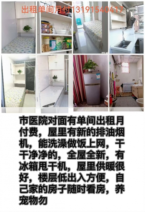 市醫(yī)院對(duì)面有單間出租月付費(fèi),全新裝修,干干凈凈的,實(shí)體墻,新的排油煙機(jī),上網(wǎng),洗澡,做飯,屋里供暖可好了,穿半袖就行,樓層低出入方便,啥都是新的,設(shè)施齊全,安靜,自己家的房子聯(lián)系13191540417(打電話(huà)加微信)
